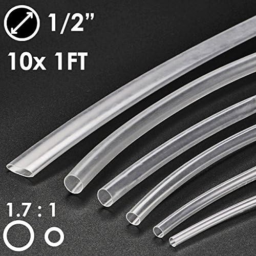 𝗦𝗜𝗭𝗘: 1/2" Diameter (Before Shrinking) | Ratio 1.7:1 𝗖𝗢𝗡𝗧𝗘𝗡𝗧𝗦: 10 Sticks of 1 Foot/ea | Color: Clear 𝗨𝗦𝗘: Heat Gun recommended to shink tubing | Shrinkage temperature: 320℃~+400℃ | Working temperature: -80℃~+260℃ 𝗦𝗣𝗘𝗖𝗦: Longitudinal shrinkage ≤5% | Hardness: 85 | Voltage: 30kv/mm | RoHS approved 𝗔𝗣𝗣𝗟𝗜𝗖𝗔𝗧𝗜𝗢𝗡𝗦: thermal and electrical insulation, wire protection, automotive wiring, DIY projects, fix broken cables, protect wire terminations and connectors