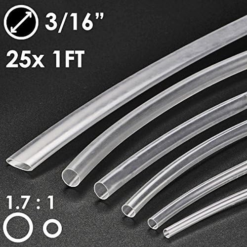 𝗦𝗜𝗭𝗘: 3/16" Diameter (Before Shrinking) | Ratio 1.7:1 𝗖𝗢𝗡𝗧𝗘𝗡𝗧𝗦: 25 Sticks of 1 Foot/ea | Color: Clear 𝗨𝗦𝗘: Heat Gun recommended to shink tubing | Shrinkage temperature: 320℃~+400℃ | Working temperature: -80℃~+260℃ 𝗦𝗣𝗘𝗖𝗦: Longitudinal shrinkage ≤5% | Hardness: 85 | Voltage: 30kv/mm | RoHS approved 𝗔𝗣𝗣𝗟𝗜𝗖𝗔𝗧𝗜𝗢𝗡𝗦: thermal and electrical insulation, wire protection, automotive wiring, DIY projects, fix broken cables, protect wire terminations and connectors