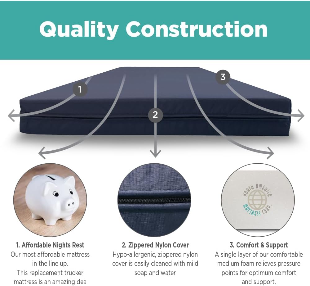 THE WORK HORSE TRUCK MATTRESS – anyone can sleep on this design and save money with our basic truck mattress design USA MADE – Designed and manufactured in the USA with eco-friendly CertiPUR-US foam, a US based program that ensures the content of foam only uses approved eco-friendly formulations. For more information visit CertiPUR-US official website. All mattresses ship compressed in a box. COMFORT & SUPPORT – 5 inch thick medium feel truck mattress engineered with medium density foam throughout the entire mattress. DURABILITY – Soft Feel with a durable and long-lasting nylon cover with heavy duty zipper is fluid resistant, crack resistant and easily cleaned with lukewarm water and gentle soap then air dried. Quality workmanship ensures our foam layers remain stable providing you long lasting comfort ECONOMICAL – Dual sided mattress may be flipped for extended life.