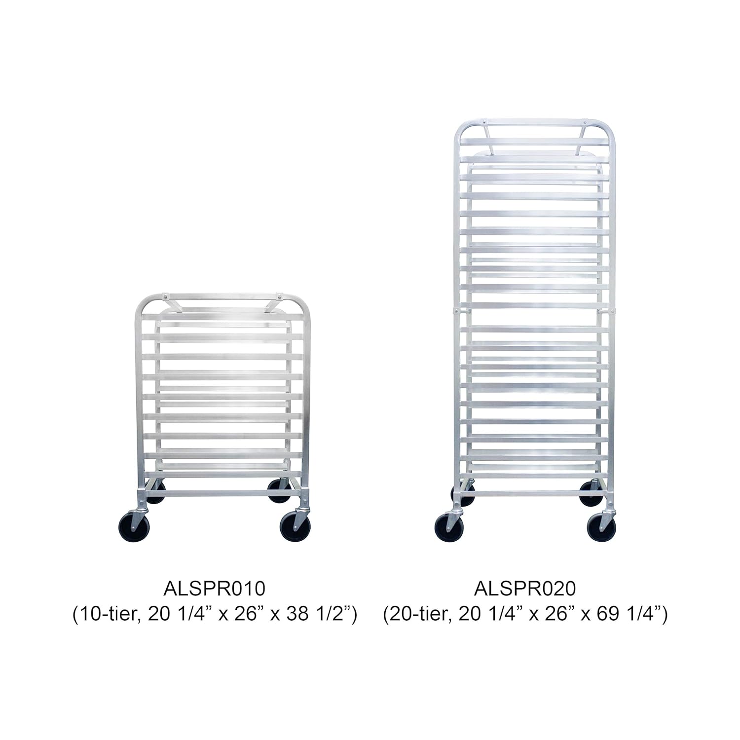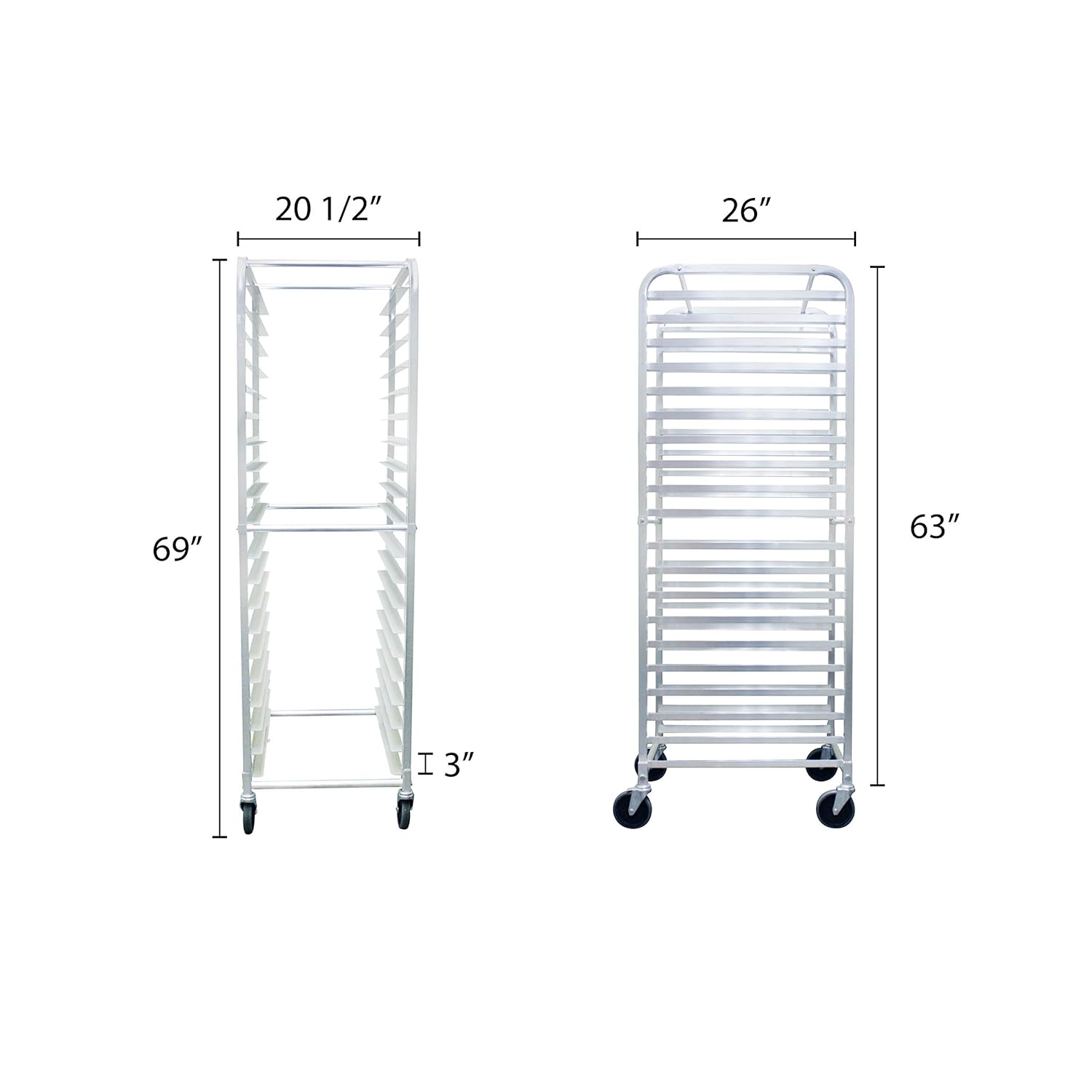 New aluminum 20-tier sheet pan rack with casters, 2 with brakes and 2 without brakes. Holds up to 20 full size 18 inch x 26 inch sheet pans or 40 half size 13 inch x 18 inch sheet pans or a variety of combinations between the two. This heavy-duty bun pan/sheet pan rack is made from 15 gauge aluminum with smooth one piece elegant curved top. It is secured with six Cross bars for support and stability. This rack loads from both front and back sides, is lightweight and easy to move around, and has tray slides firmly welded to frame posts. It also features rubber-coated 5 inch swivel casters (2 with brake and 2 without brake). it is great for saving space in tight kitchens and transporting food between locations. Height between pan slides: 3 inches. 20-pan rack: 26 inch long, 20-1/4 inch wide, 69-1/4 inch tall. Able to carry up to 20 full-size 18 inch x 26 inch full size sheet pans or 40 half-size 18 inch x 13 inch half size pans. This unit include: pan rack with wheels as described, instructions, and hardware for assembly (wrench (not included) required for setup). ideal for use in any kitchen, bakery, restaurant, cruise line, hotel, pizzeria, cafeteria, institution, or any commercial use. Nsf approved. Simple assembly required. Clear pan rack cover sold separately.