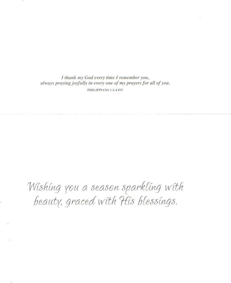 This is for a set of 8 deluxe foil Christmas cards made in the USA! Style: Chickadee, Season Graced with His Blessings (Silver Foil) This card set contains 8 top-fold cards measuring 5" x 7" and 8 white envelopes. The cover shimmers and shines as the floral scroll on the left and right sides consist of a beautiful shiny silver foil scroll! Sentiment: Joyful Tidings. Inside: Wishing you a season sparkling with beauty, graced with His blessings. Scripture on lower top fold: I thank my God every time I remember you, always praying joyfully in every one of my prayers for all of you. PHILIPPIANS 1:3-4 ISV Celebrate in style while letting someone know you truly care with these beautiful 8 religious Christmas cards!