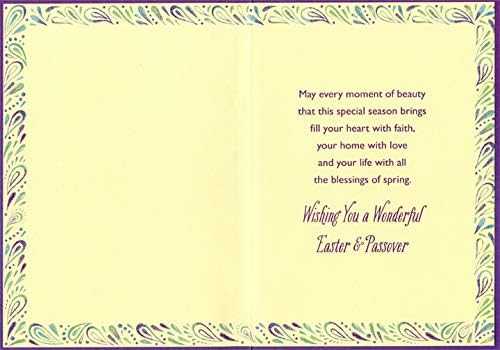 Front Message: Blessings to You at Passover and Easter Inside Verse: May every moment of beauty that this special season brings fill your heart with faith, your home with love and your life with all the blessings of spring. Wishing You a Wonderful Easter and Passover Card Size: 5.25x7.5 inches Includes: 1 card / 1 purple envelope Special Features: Non-Flake Glitter, Spot UV Coating, Embossed, Insert, Full Color Interior