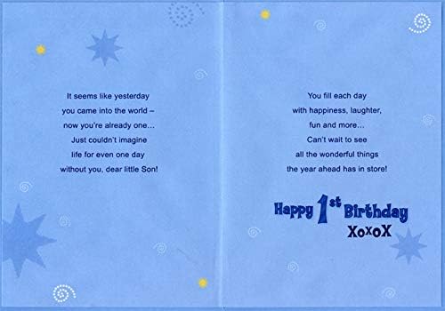 Front Message: For a Very Special Son On Your 1st Birthday Inside Verse: It seems like yesterday you came into the world - now you’re already one… Just couldn’t imagine life for even one day without you, dear little Son! - You fill each day with happiness, laughter, fun and more… Can’t wait to see all the wonderful things the year ahead has in store! Happy 1st Birthday - XOXOX Card Size: 5.25x7.5 inches Includes: 1 card / 1 white envelope Special Features: Silver Foil, Spot UV Coating, Embossed, Insert, Full Color Interior