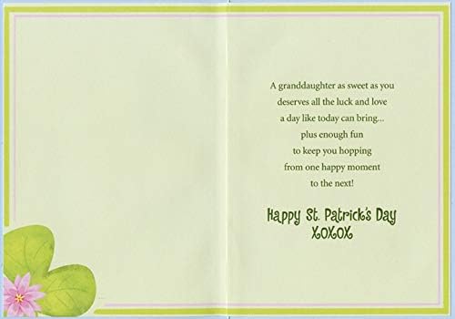The interior of this Designer Greetings st. patrick’s day card design reads: A granddaughter as sweet as you deserves all the luck and love a day like today can bring… plus enough fun to keep you hopping from one happy moment to the next! Happy St. Patrick’s Day - XOXOX. The card measures 5.25x7.5 inches and is printed on heavy cardstock. Includes 1 card and 1 envelope. The card has the following special features: non-flake glitter, spot uv coating, embossed, insert, full color interior.