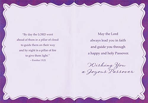 Front Message: Passover Blessings Inside Verse: By day the LORD went ahead of them in a pillar of cloud to guide them on their way and by night in a pillar of fire to give them light. ~ Exodus 13:21 - May the Lord always lead you in faith and guide you through a happy and holy Passover. Wishing You a Joyous Passover Card Size: 5.25x7.5 inches Includes: 1 card / 1 blue envelope Special Features: Gold Foil, Spot UV Coating, Embossed, Insert