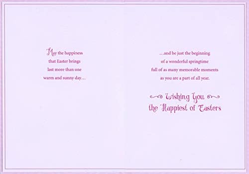 The interior of this Designer Greetings easter card design reads: May the happiness that Easter brings last more than one warm and sunny day… …and be just the beginning of a wonderful springtime full of as many memorable moments as you are a part of all year. Wishing You the Happiest of Easters. The card measures 5.75x8 inches and is printed on heavy cardstock. Includes 1 card and 1 envelope. The card has the following special features: non-flake glitter, spot uv coating, embossed, insert, full color interior.