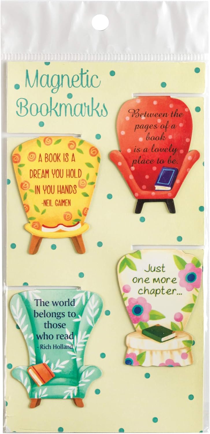 Charming bookmark feature 4 magnetic cozy chairs with sentiments perfect for the book worm in your life Decorative magnet and bookmark are made of a durable vinyl material; Spot clean Decorative spot holder measures approximately 2.5 x 2 inches Perfect way to creatively hold your place in your favorite book Contained in protective packaging; Ready for gifting