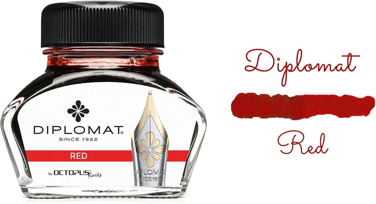 Diplomat 30ml Ink Bottle, Fountain Pen Ink - Red (D41001005) Diplomat is proud to accounce its collaboration with Octopus Fluids to launch a wide range of 15 beautiful different ink colours, these inks boast a seamless everyday writing experience. Discover the Diplomat by Octopus Inks and express your personality and mood. Diplomat 15 beautiful Ink colors are available to create beautiful writing. A new innovation in Diplomat’s products is their new 30ml ink bottles. Formulated to provide the ultimate writing experience, Diplomat’s Octopus ink is perfect for fountain pen enthusiasts who love quality writing. Diplomat inks flow smoothly and are of the highest quality. Diplomatic ink collection is a wide panel of brightful inks in elegant bottles, developed to fit perfectly with any fountain pens. These diplomatic octopus inks perfect for use for both piston or converter filling systems as well as fountain pens using dip pens. Choose from our range of colors and embark on a smooth writing journey with Diplomat Inks. This Diplomat Octopus Ink Bottle Red is a shade of Red packaged and is sold in an elegant 30ml glass bottle. The rich weight and its soft curves make it a pleasure to hold in your hands. It is an ornament on every table. As with every lab-scale batch and every writing test, their requirements about pleasant beautiful colors, optimum drying time, low degree of frying, quick writing and smooth gliding are an obsession. Features Brand: Diplomat Brand Origin: Germany Writing Ink Color: Red Material: Glass Ink Bottle Size - 30ml (1.01 oz.) Type: Bottled Ink Product Code: D41001005 Special ingredient that ensures extra smooth writing. Very smooth and well lubricated and fairly quick dry time. Series: Diplomat Octopus Ink Bottle Red Distributed in the USA by Lanier Pens