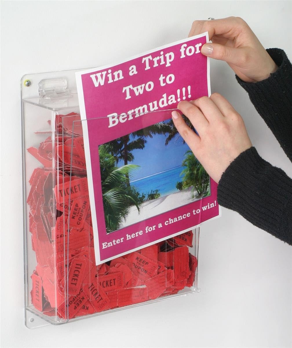 Wall-mounting unit is easy to install. Locking box keeps tickets and entry forms secure within the container. 8.5 by 11 inch sign holder is located at the front of the unit; perfect for displaying advertisements or instructions. Security pen included with every purchase.
