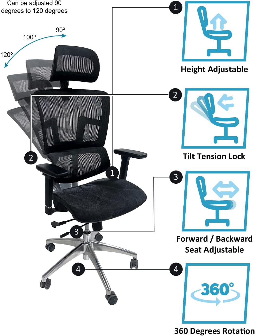 ERGONOMIC HOME OFFICE CHAIR: The ergonomic home or office chair provides 4 supporting points for the head, back, hands and a proper lumbar support. It’s easy to adjust seat height, headrest, armrest, and backrest tilt. Offering comfortable support for your entire body during long work periods. LARGE CHAIR MESH SEAT, BACK AND HEADREST: The dimensions of the office chair are built so it could accommodate different body types. With the adjustable features it can offer the user the best ergonomic support. The Loading Capacity of this office or home office chair is 280 lbs. Suitable for people of about 5.5ft to 6.3ft. MULTI FUNCTION CHAIR: This office mesh chair’s seat can be adjusted up to 4" up and down accordingly, for multi-tasking convenience. With the 360 Degree Swivel you can find the correct and comfortable position. The tilt tension adjusting offers you to rock back and forth between 90 and 120 degrees with your preferred choice of tension. This office mesh chair makes it convenient for you to rest your arms at your preferred height and angle. The headrest for this office chair can swivel 45 degrees to your preference and adjustable up and down by 2 in. BREATHABLE HEAVY-DUTY MESH OFFICE CHAIR: ErgoMax Office mesh chair keeps the air circulating allowing you to enjoy your work and be comfortable. This heavy-duty quality mesh will support your back, head, and legs for long-sitting hours for many years to come. EASY INSTALLATION AND WARRANTY: We strive to make it the easiest office chair to assemble. Our detailed instruction manual along with the instructional video will make certain that you install it within less than 20 minutes. All ErgoMax office chairs are under the ErgoMax Office 1 year Hassle-Free Warranty.