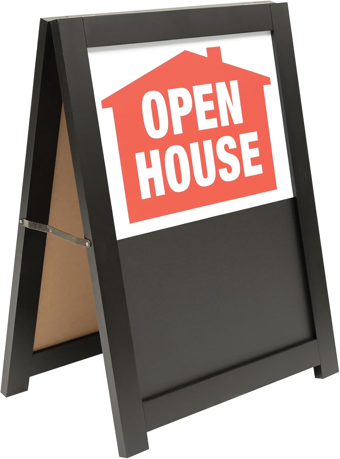 DUAL-SIDED DESIGN - Each side of the sign measures 19x25 inches, providing maximum visibility and exposure for your message. EYE-CATCHING LAYOUT - The upper half of each side boldly displays “Open House” in striking red and white, instantly grabbing attention and informing passersby. CUSTOMIZABLE CHALKBOARD SPACE - The bottom half of each side is dedicated chalkboard space, allowing you to personalize messages, promotions, or event details with ease. DURABLE CONSTRUCTION - Made from sturdy wood with a sleek black finish, the frame exudes professionalism while withstanding outdoor elements. CONVENIENT FEATURES - Equipped with metal hinges and latches, this A-frame sign offers easy setup, storage, and transportation, making it perfect for on-the-go advertising and promotions.