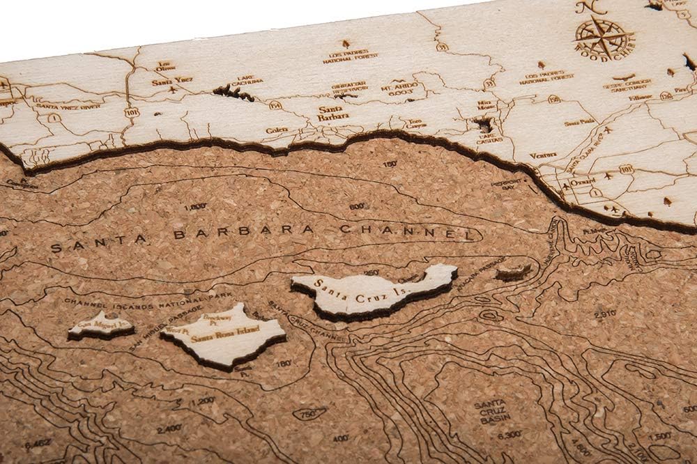 Woodchart’s stand-alone cork board map, featuring Santa Barbara and the Channel Islands. Perfect for decorating the office! Stands up by itself on a tabletop or desk. The map face is carved out of Baltic birch and the water depths are etched into the cork.