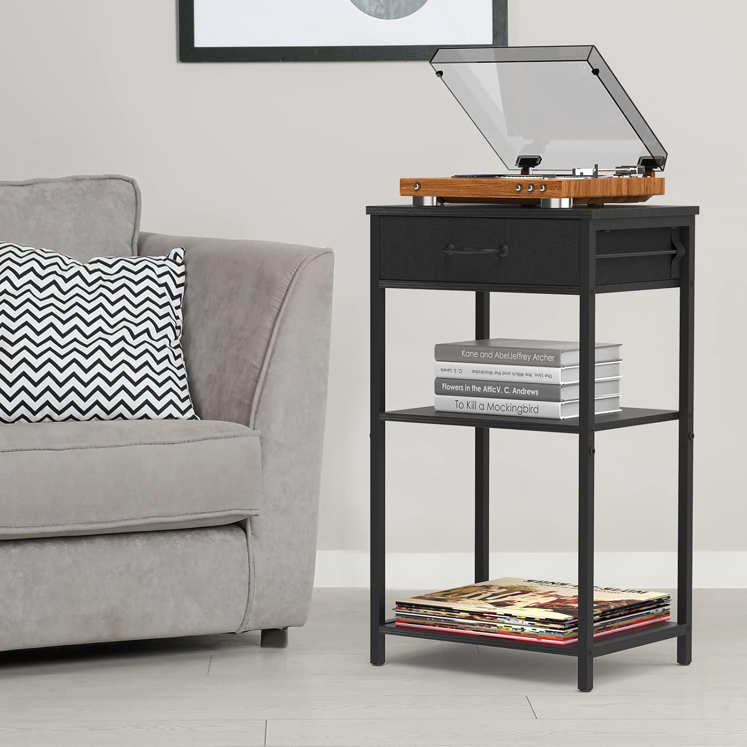 【Proper Size】Measuring 15.7 x 11.8 x 27.5 inches, the home printer stand is perfect for a small space next to desk or sofa, but not too bulky to move. And the small shelf stand has a hassle-free daily clean - just wipe it down with a towel. 【Great Storage】Large capacity printer stand under desk with three layers of open storage and one layer of fabric drawer is the perfect organizer for placing printers, fax machines and private documents. Small printer stand to vacate empty desktop space, improve work comfort. 【Sturdy Printer Shelf】Made from sturdy square tube frame and MDF wood, the desk side table is solid and easy to clean daily. Four adjustable foot pads further enhance the stability of the printer holder rack so that even adults can sit on it without being easily crushed. 【Awesome 3 Tier Table】A modern black nightstand with drawer that matches office/home decor while providing reassuring storage features is definitely an awesome desk side storage stand! 【Value for Money】In addition to the fax machine and printer shelf, put in the office as a 3 tier storage organizer shelf, bedroom bedside table/nightstand with storage, living room side table is the perfect choice. 【Easy Installation】Equipped with detailed product installation instructions and video tutorials, it is easy to complete the installation of the printer table for home office, and fast use! 【Shopping Instructions】NOVIMANGO wants every customer to have the best shopping experience. Please check whether the accessories are complete after you receive the printer table. If there is any problem about our printer stand for desk, we are ready to serve you.