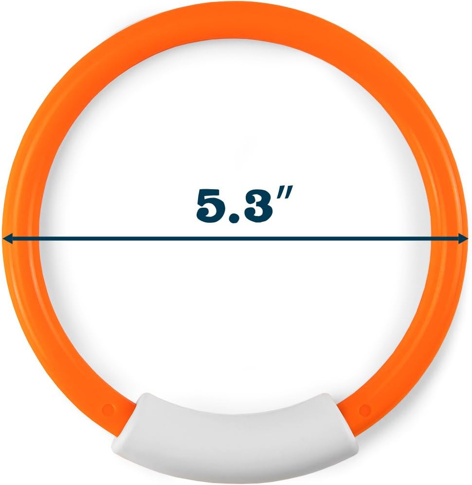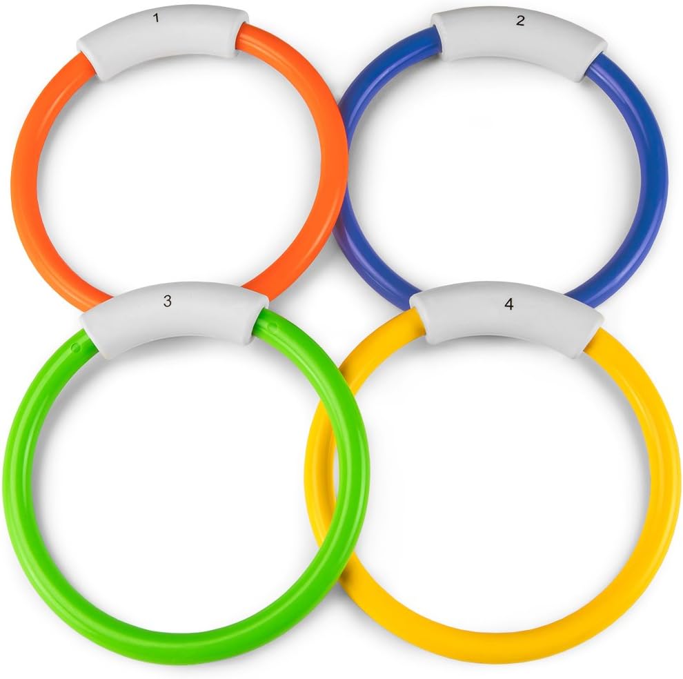 Make waves & dive deep with this set of sinking pool rings! Perfect for swim lessons, pool games, and fun in the summer sun, toss these rings into the pool, watch ’em sink, then dive right in. Need a game idea? Gather some friends and have all divers stand with their backs to the pool. Have one person toss all the rings in the pool and call out a color. On the count of 3, the divers jump in and race to collect the correct pool ring. Whoever grabs it first gets to be the caller next! Not only are these diving rings perfect for all sorts of fun games, but did you know they also function as a learning tool? Who says you can’t get an education relaxing at the pool! Help your child learn colors and numbers while going for a swim. Each ring has a weighted grip labeled with a number for safe and easy handling. Perfect for children ages 5+.