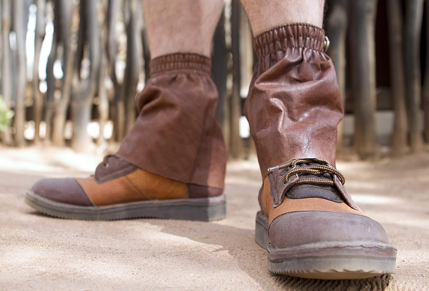 DUE TO FISH & WILDLIFE DEPARTMENT RESTRICTIONS, WE DO NOT SHIP GAME SKIN LEATHER PRODUCTS OUTSIDE OF THE CONTINENTAL UNITED STATES. PLEASE, NO EXCEPTIONS. Safari Leather Gaiters, made from genuine buffalo skin, are great sock protectors to stop sand and stones from entering your hiking boots and making you uncomfortable. Gaiters with elastic tops keep grass burs from sticking to your shoe laces and making your skin itch. Brass snaps and Velcro in the back make them easy to put on and take off. These safari leather gaiters, made in Africa from durable soft buffalo leather, retain all their natural tick marks and are just the protection your feet need when hiking and hunting in remote places. Please note that these cannot be shipped outside of the United States. Size Large is recommended for most men, Size Medium is recommended for most women or for a tighter fit, Size Small is recommended for most youth. Size X-Large when available are suitable for use over Thick Pants. Very Few folks would need Size XL - Size Large work well for both on the Ankle use or over regular Hunting Pants.