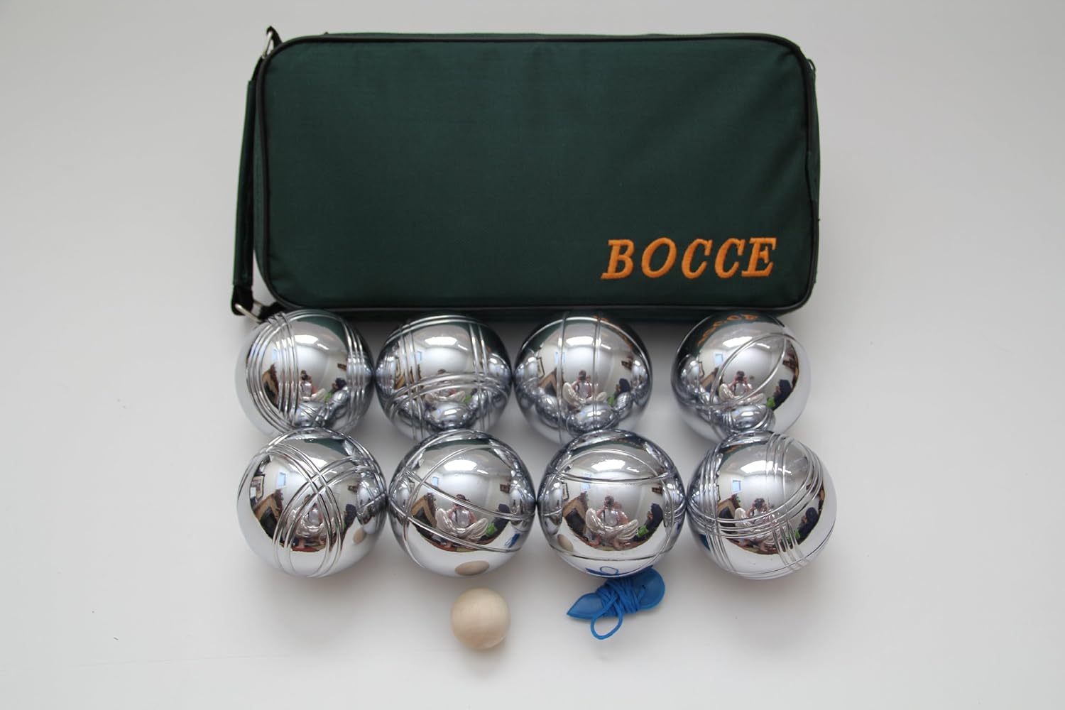 Bocce/Petanque set includes 8 balls with 2 different striping patterns, a green bag, a wooden jack and a basic measuring device. Also on Amazon, we offer a 3 pack version of this product and provide different colored bags.