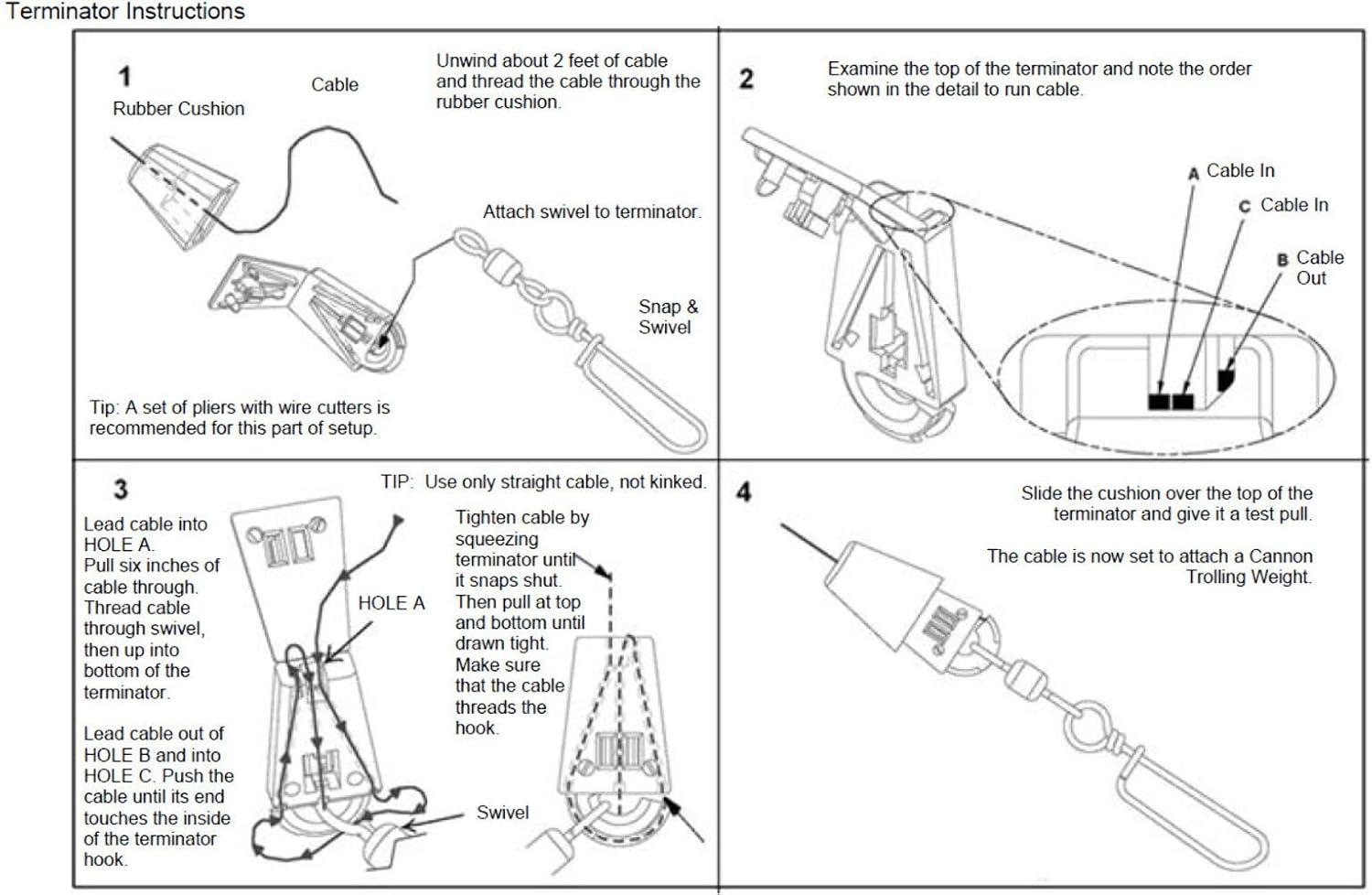 Quantity of 6 Cannon’s Downrigger Weight Terminator connects the downrigger weight to the downrigger cable. Built rugged to withstand loads of abuse, this true-tracking Downrigger Weight Terminator includes one crimpless snap on terminator, one snap on swivel and one cushion cartridge.