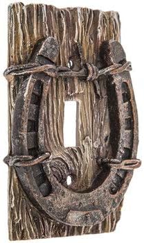 Horseshoe Single Switch Plate is the perfect way to bring a touch of outdoor charm into your home. In shades of brown, this resin cover features realistic faux wood grain and a detailed faux barb wire-wrapped horseshoe. Perfect for a cowboy or western-themed man cave.