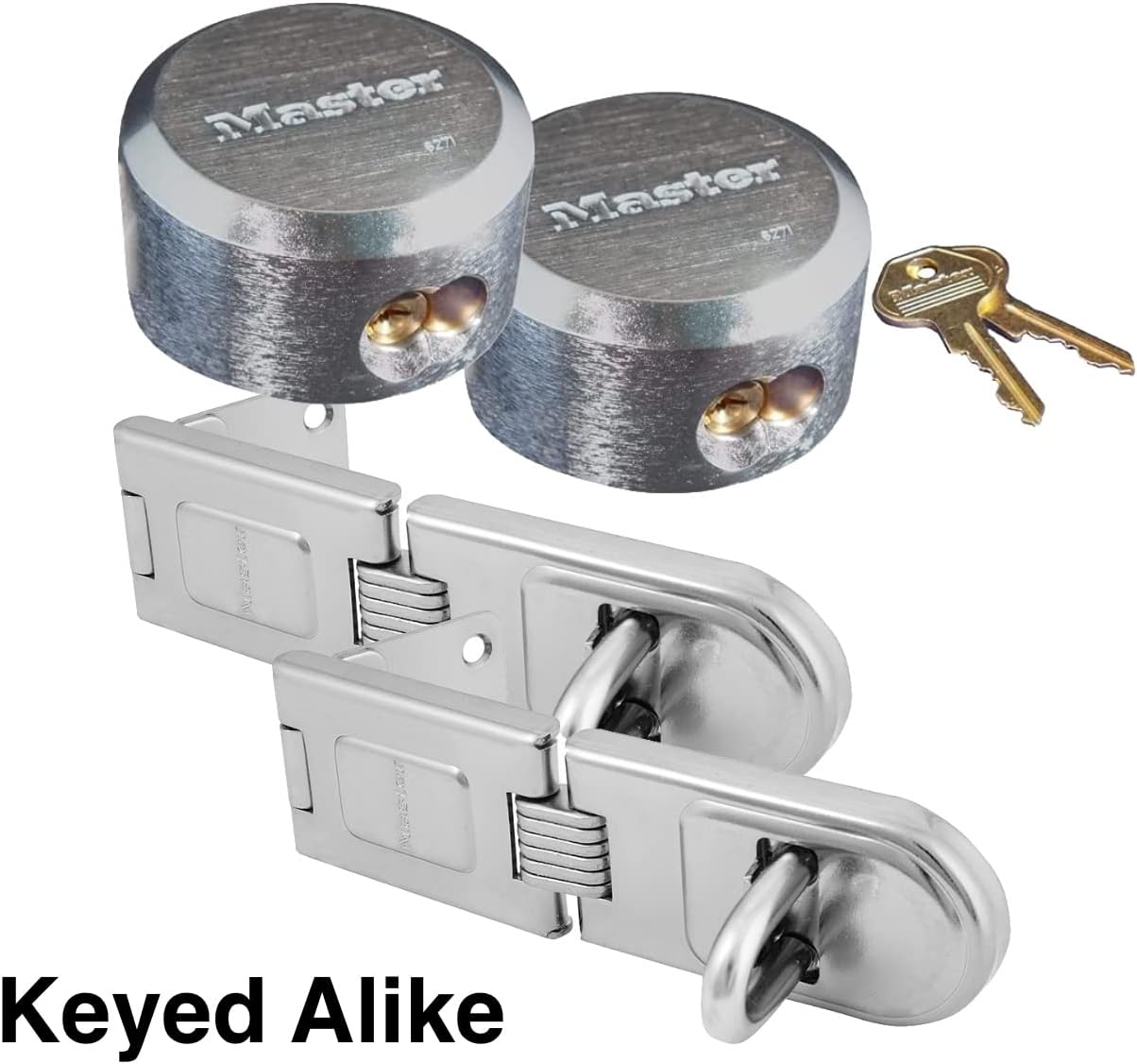 Two Hardened Hasp & Lock Combination - Keyed Alike by Master Lock - Model 720-6271KA. This listing is for two hardened steel hasps and two high security hidden shackle padlocks. You will receive two complete sets and four keys. Comes with all the necessary hardware for installation. The Master Lock No. 720DPF Hasp features a 6-1/4in (16cm) long hardened steel body. The zinc plated hardened steel hasp provides added strength and weatherability. The hardened boron alloy staple offer maximum protection against cutting and sawing. The hinged body is Ideal for reaching around corners and securing hard-to-lock property. If you would like to purchase three hasp/lock combinations please purchase this two pack plus one single combination 720 - 6271. When purchasing even quantities buy as many two packs as needed. If requiring an odd quantity, purchase as many two packs as necessary plus a single keyed alike lock - available in our Amazon Store.