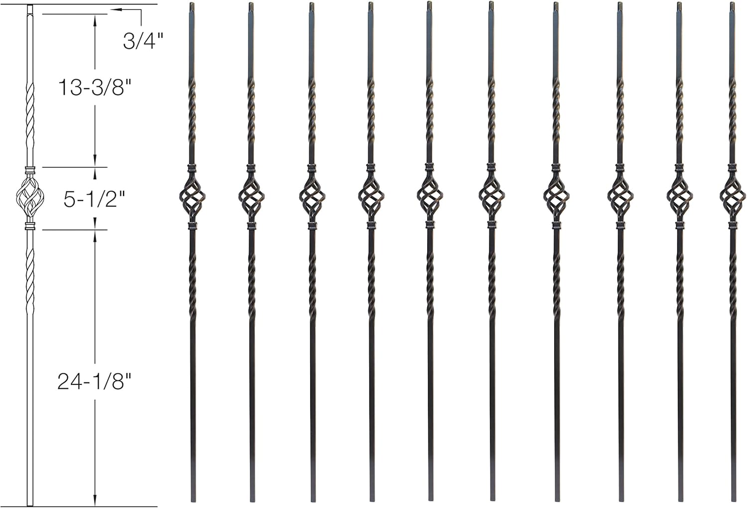 Individual Baluster in single basket style. “Ascension Stair Parts” Iron balusters come in a variety of styles and colors allowing for the user to create a custom pattern. Combining this level of customization with our hollow design allows for quick cuts and easy installation. Powder coated finishes in a variety of colors gives you the ability to make your staircase a stand-out visual feature of your home.