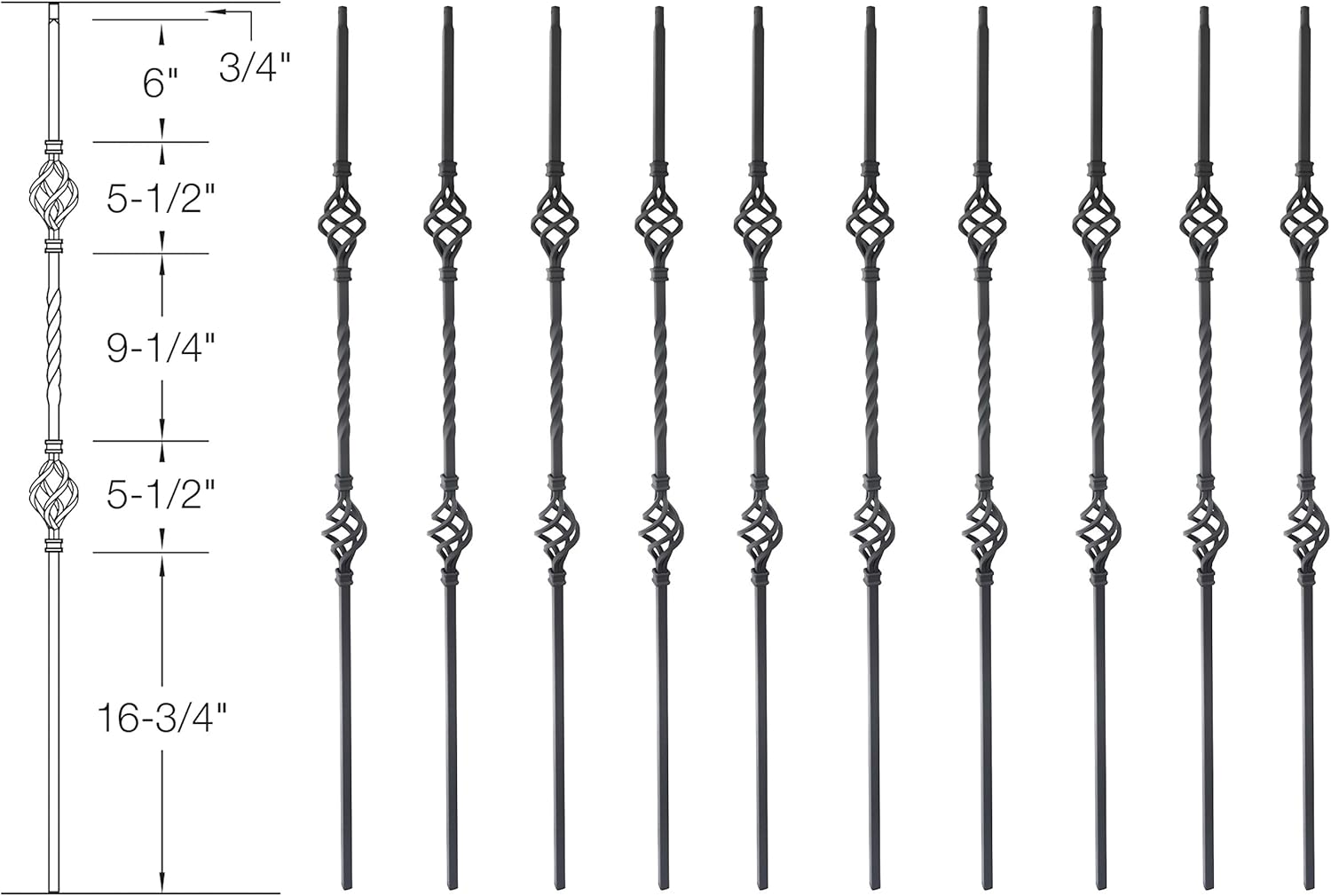 Individual Baluster in double basket style. “Ascension Stair Parts” Iron balusters come in a variety of styles and colors allowing for the user to create a custom pattern. Combining this level of customization with our hollow design allows for quick cuts and easy installation. Powder coated finishes in a variety of colors gives you the ability to make your staircase a stand-out visual feature of your home.