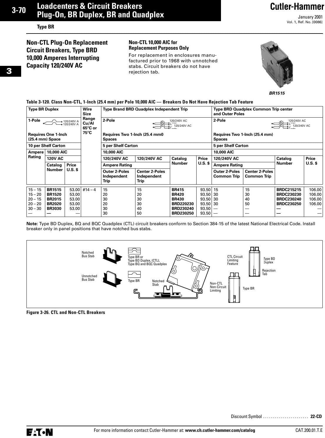 1". 20/20 amp, 120 vac. 2-single pole. Interchangeable. Not interchangeable with Square D Homeline panels. 10,000 AIR. Switch indicator. Non-circuit limiting. Protects wire from overheating and current overload. Plug-in. Fits (Westinghouse/Bryant/ Cutler-Hammer)-BR (Sylvania/ Challenger/T&B). Standard overload and short circuit protection in Cutler- Hammer, Westinghouse, Bryant, Challenger, or Sylvania load centers. For NON CTL (circuit limiting) QO load centers without bus bar slots-for use in load centers manufactured prior to 1968. Tandem breakers offer two circuit protection while only requiring one space in a load center. UL listed. C.S.A. approved. Bulk. Manufacturer number: BR2020. SKU #: 36108. Country of origin: Dominican Republic. Distributed by Eaton Corporation.