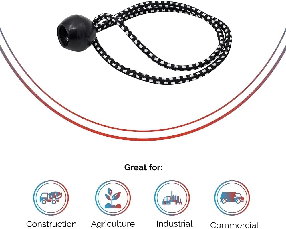 ππππππ ππππ πππππ: Made from high-grade durable elastic (cord) and rugged nylon (ball), Tarps Now’s tarp bungee ball cords keep your tarps on the ground secure and safe. The size of these Tarp bungee ball cords is 11 inches and the Cord color is Black with White accent bungees ππππππππ πππππππ ππππ: Our bungee ball elastic cords have high stretchiness to tie them around all sorts of loops, poles, and pillars for incredible dependability, they wonβt break or split easily with force. It stretches up to 15.5" in length ππππππ-π πππ πππ ππππ: These tie-downs will not take a long time or make you bored when you need to tie something with it. just wrap through grommets, around poles, or anything else that needs to be secured. ππππ ππ πππ: Come in a very easy installation process. You can remove when not in use or reposition where necessary. Bungee cords are reusable. πππππππππ ππππ: These bungee cords have multiple uses like fasten tarps or cover to the canopy frames and with grommets, organize and secure hoses, cords, or wires. Useful for indoor and outdoor.