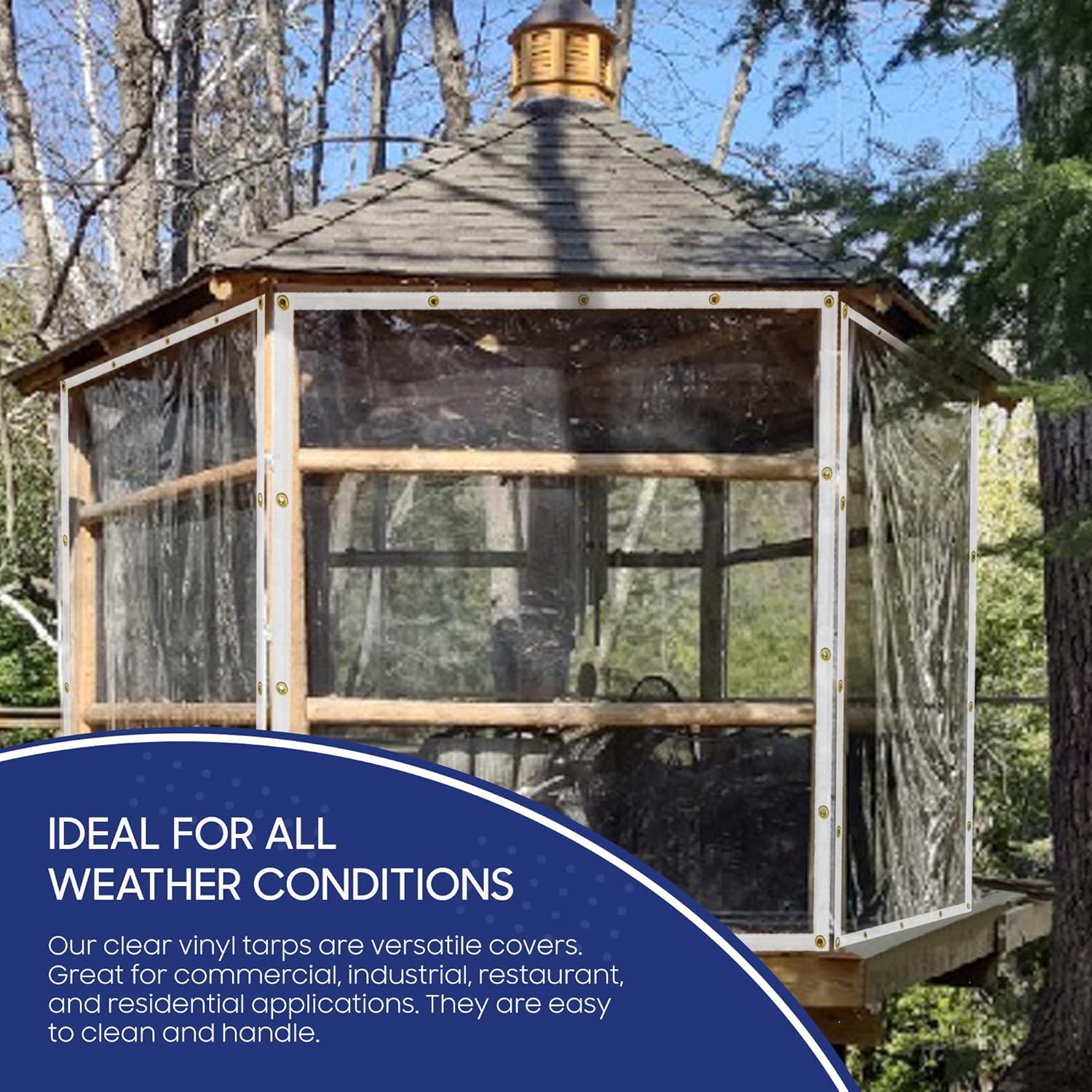 𝐂𝐋𝐄𝐀𝐑 𝐕𝐈𝐍𝐘𝐋 𝐓𝐀𝐑𝐏: Made of 100% marine-grade heavy-duty clear PVC material. Our tarp cover is soft in touch (2S) and ensures to perform in all weather conditions with long-lasting durability 𝐏𝐄𝐑𝐅𝐄𝐂𝐓 𝐅𝐎𝐑 𝐀𝐋𝐋 𝐂𝐎𝐍𝐃𝐈𝐓𝐈𝐎𝐍: Our tarps consist of double-needle stitched hems that are strengthened with 1 1/2" wide, white polypropylene webbing so It can withstand beat cold weather as low as -30 degrees Fahrenheit 𝐌𝐄𝐀𝐒𝐔𝐑𝐄𝐌𝐄𝐍𝐓: The size of this tarp cover is 8’ x 15’ and the weight is 18 oz. It is portable and easy to store. The thickness is 20 Mil for maximum coverage 𝐁𝐑𝐀𝐒𝐒 𝐆𝐑𝐎𝐌𝐌𝐄𝐓𝐒: These marine-grade tarp covers are crafted with #2 brass grommets in the corners for secure tiedown and spaced approximates every 24-inches around the perimeter 𝐌𝐔𝐋𝐓𝐈𝐏𝐔𝐑𝐏𝐎𝐒𝐄 𝐔𝐒𝐄𝐒: Our tarp cover is usable both indoor and outdoor. Great for construction, agriculture, commercial and industrial applications. It is also easy to keep clean