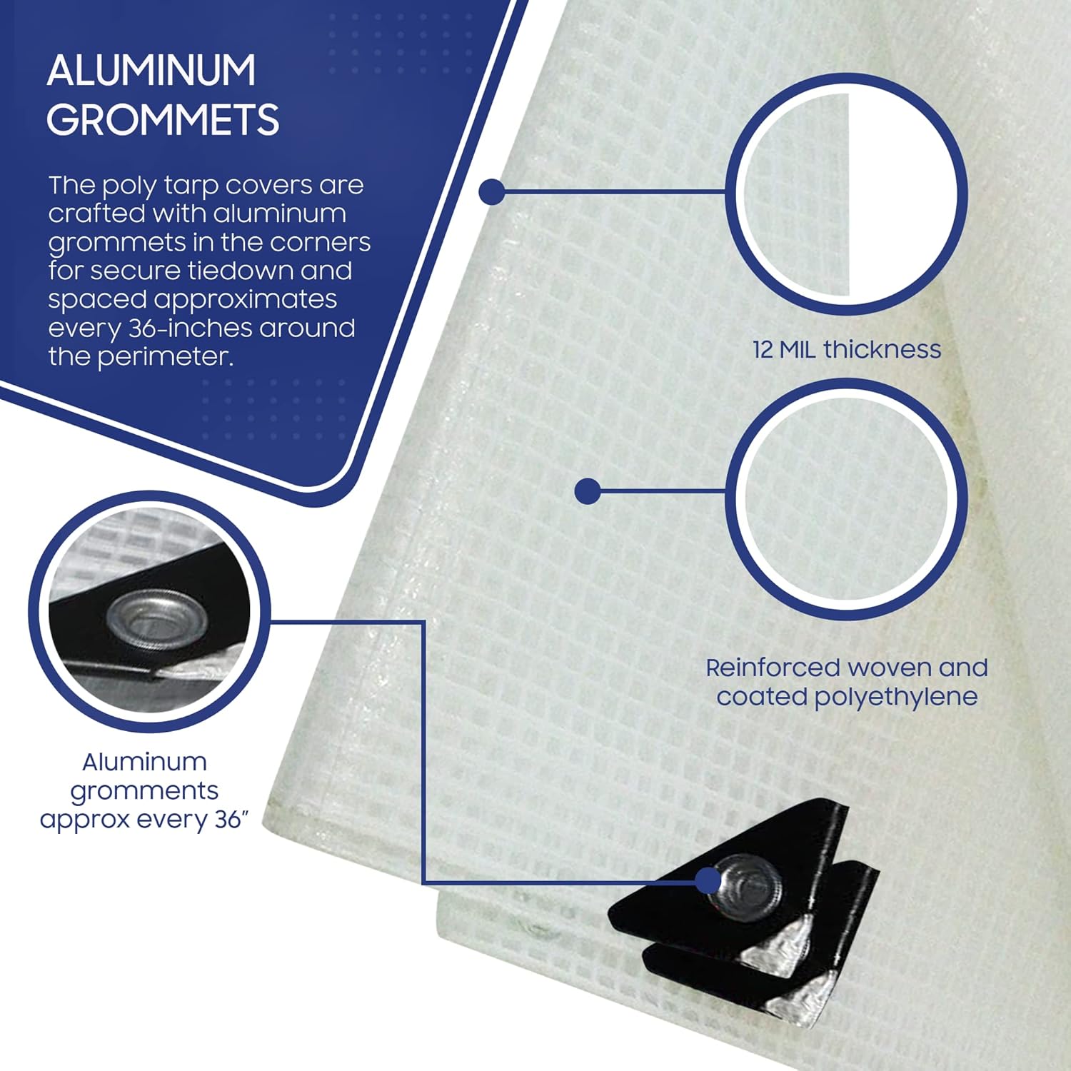 𝐓𝐑𝐀𝐍𝐒𝐋𝐔𝐂𝐄𝐍𝐓 𝐏𝐎𝐋𝐘 𝐓𝐀𝐑𝐏𝐒: These translucent poly tarps are constructed of premium grade 3 Ply material and both sides are coated with solid polyethylene that is incredibly durable, waterproof, economical, and strong. This material has a translucent clear view with white strings. It is not as clear as glass. 𝐇𝐄𝐀𝐕𝐘-𝐃𝐔𝐓𝐘 𝐓𝐀𝐑𝐏𝐒: Our tarps have a 14 x 14 Mesh count per square inch and hems reinforced woven with rope and coated polyethylene finish to prevent edge wear and deformation. Withstand against tough weather conditions to remain flexible even under harsh arctic temperature conditions. 𝐌𝐄𝐀𝐒𝐔𝐑𝐄𝐌𝐄𝐍𝐓: The size of this tarp cover is 50’ X 50’ and the weight is 6oz per square yard. The thickness is 14 MIL. It is portable and easy to storage. The color is clear/white and are not optically clear. These tarps are cut size and finish 6" smaller in size. 𝐀𝐋𝐔𝐌𝐈𝐍𝐔𝐌 𝐆𝐑𝐎𝐌𝐌𝐄𝐓𝐒: These translucent white string poly tarps covers are crafted with #2 aluminum grommets in the corners for secure tiedown and spaced approximates every 36-inches around the perimeter. 𝐌𝐔𝐋𝐓𝐈𝐏𝐔𝐑𝐏𝐎𝐒𝐄 𝐔𝐒𝐄𝐒: Our tough tarp cover is usable both indoor and outdoor. Great for construction, agriculture, commercial and industrial applications. It is also easy to keep clean.