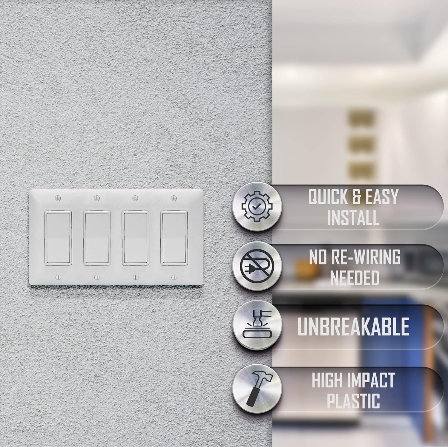 BRIGHTEN UP YOUR DECOR Make a significant upgrade to your renovation and home improvement efforts. Our MASQUE cover-up electrical outlet covers and toggle switch wall plates can upgrade the appearance of any room in seconds by securely covering older fixtures. Deal with discolored decorator outlets and yellowed, cracked, or paint-stained outlet covers with ease. Simply replace the older rocker switch or wall outlet cover with this one and you’ll get a bright, new-looking outlet in minutes. The jumbo size also lets you cover up older overpainted edges so you don’t have to waste time on them either. QUALITY DECORATOR WALL PLATES FOR A CONTEMPORARY FEEL Enjoy classy new electric outlets and switches in your remodeled home or shop. Our smooth, decorative wall outlet covers have a designer look with unobtrusive features and a smooth finish for easy cleaning. They’ll blend right in with the subdued home decor or with commercial establishment fixtures. They’ll also resist normal wear and tear in your new setting. Our wall plates for electrical outlets and toggle switches are made from high-quality plastic. These nearly-unbreakable plates won’t crack or distort during installation, making your job much easier. EASY INSTALLATION Save time and money on installing our discreet cover fixtures. You won’t need to replace and re-wire the entire electrical outlet. All you have to do is remove the old cover and screw our newer cover into place using the provided screws with a matching finish. You can refit several older electrical outlet covers in the room within minutes. Get our MASQUE cover-up electrical outlet covers and rocker switch wall plates today and make fast, impressive upgrades to your existing wall fixtures.