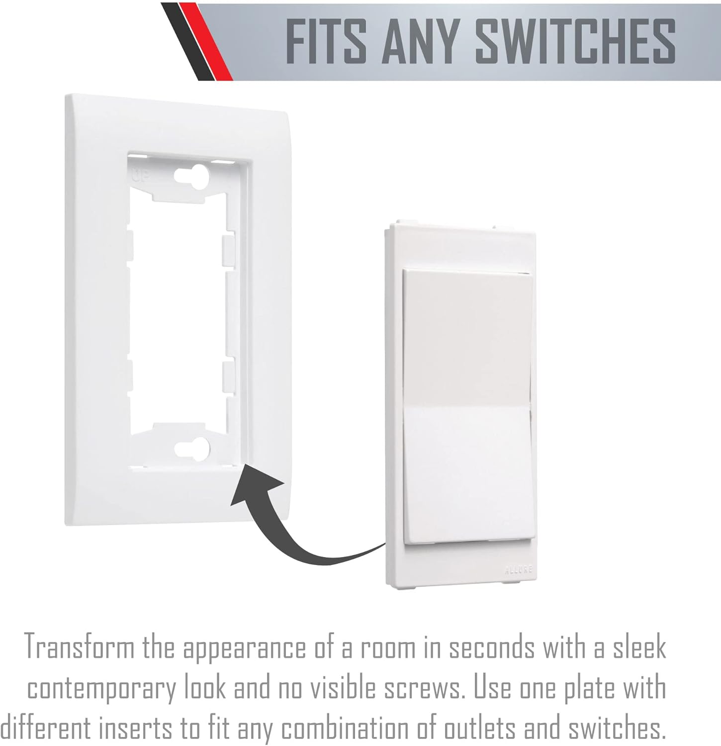 BRIGHTEN UP YOUR DECOR Make a significant upgrade to your renovation and home improvement efforts. Our ALLURE cover-up electrical outlet covers and toggle switch wall plates can upgrade the appearance of any room in seconds by securely covering older fixtures. Deal with discolored decorator outlets and yellowed, cracked, or paint-stained outlet covers with ease. Simply replace the older rocker switch or wall outlet cover with an ALLURE electrical outlet cover, snap this insert into place, and you’ll get a bright, new-looking outlet in minutes. The jumbo size also lets you cover up older overpainted edges so you don’t have to waste time on them either. QUALITY DECORATOR WALL PLATES FOR A CONTEMPORARY FEEL Enjoy classy new electric outlets and switches in your remodeled home or shop. Our smooth, decorative wall outlet covers have a designer look with unobtrusive features and a smooth finish for easy cleaning. They’ll blend right in with the subdued home decor or with commercial establishment fixtures. They’ll also resist normal wear and tear in your new setting. Our wall plates for electrical outlets and toggle switches are made from high-quality plastic. These nearly-unbreakable plates won’t crack or distort during installation, making your job much easier. EASY INSTALLATION Save time and money on installing our discreet cover fixtures. You won’t need to replace and re-wire the entire electrical outlet. All you have to do is remove the old cover and screw our newer cover into place using the provided screws with a matching finish. You can refit several older electrical outlet covers in the room within minutes. Get our ALLURE cover-up electrical outlet covers and rocker switch wall plates today and make fast, impressive upgrades to your existing wall fixtures.