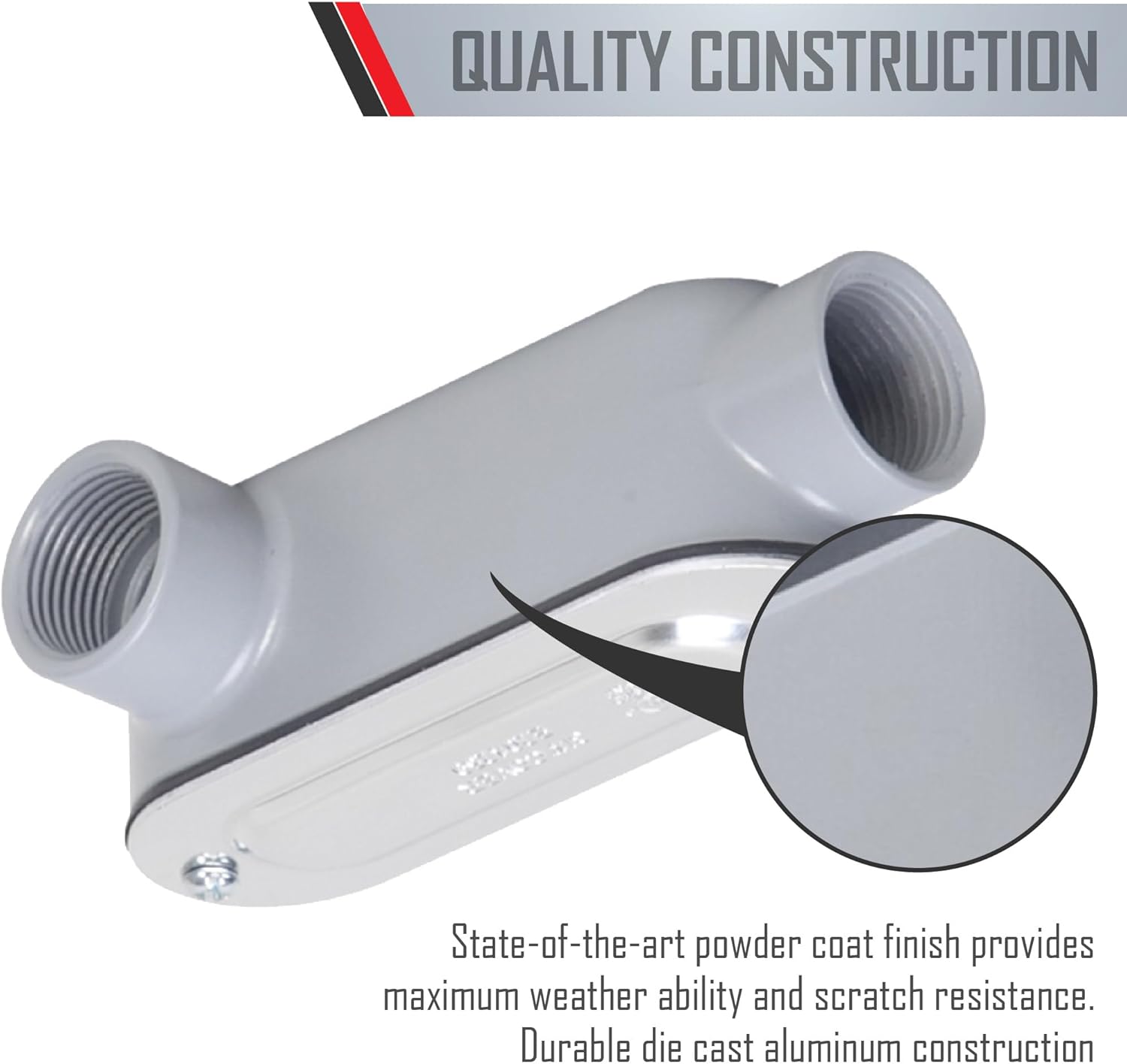 Durable die cast aluminum construction Premium powder coat finish Includes NBR synthetic rubber gasket Stamped aluminum cover Combination head screw
