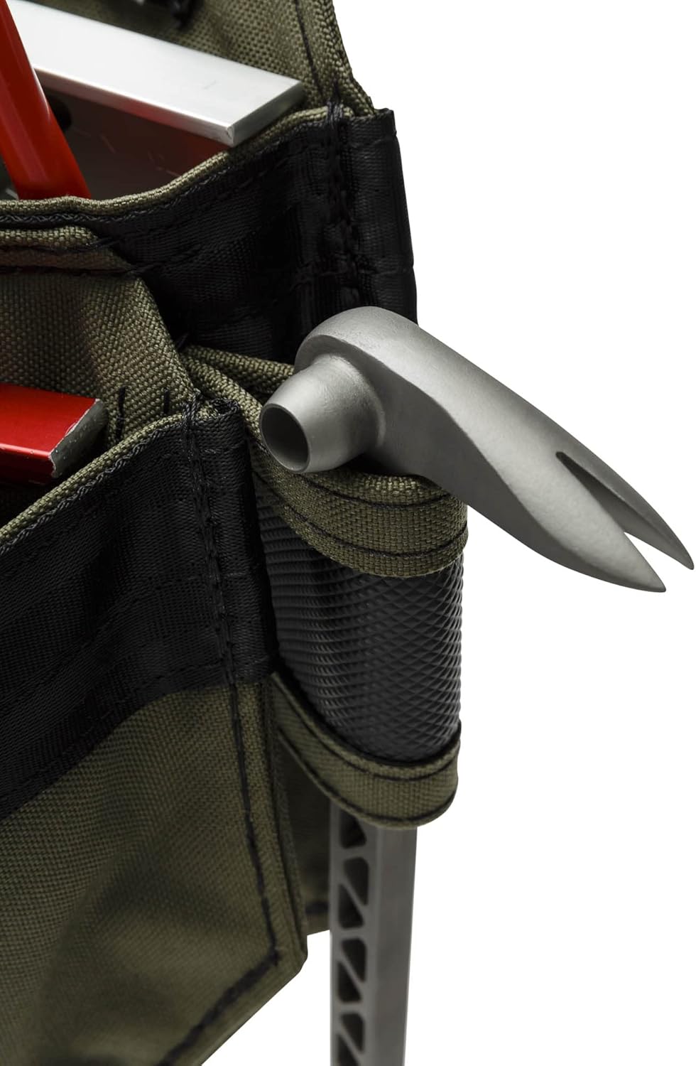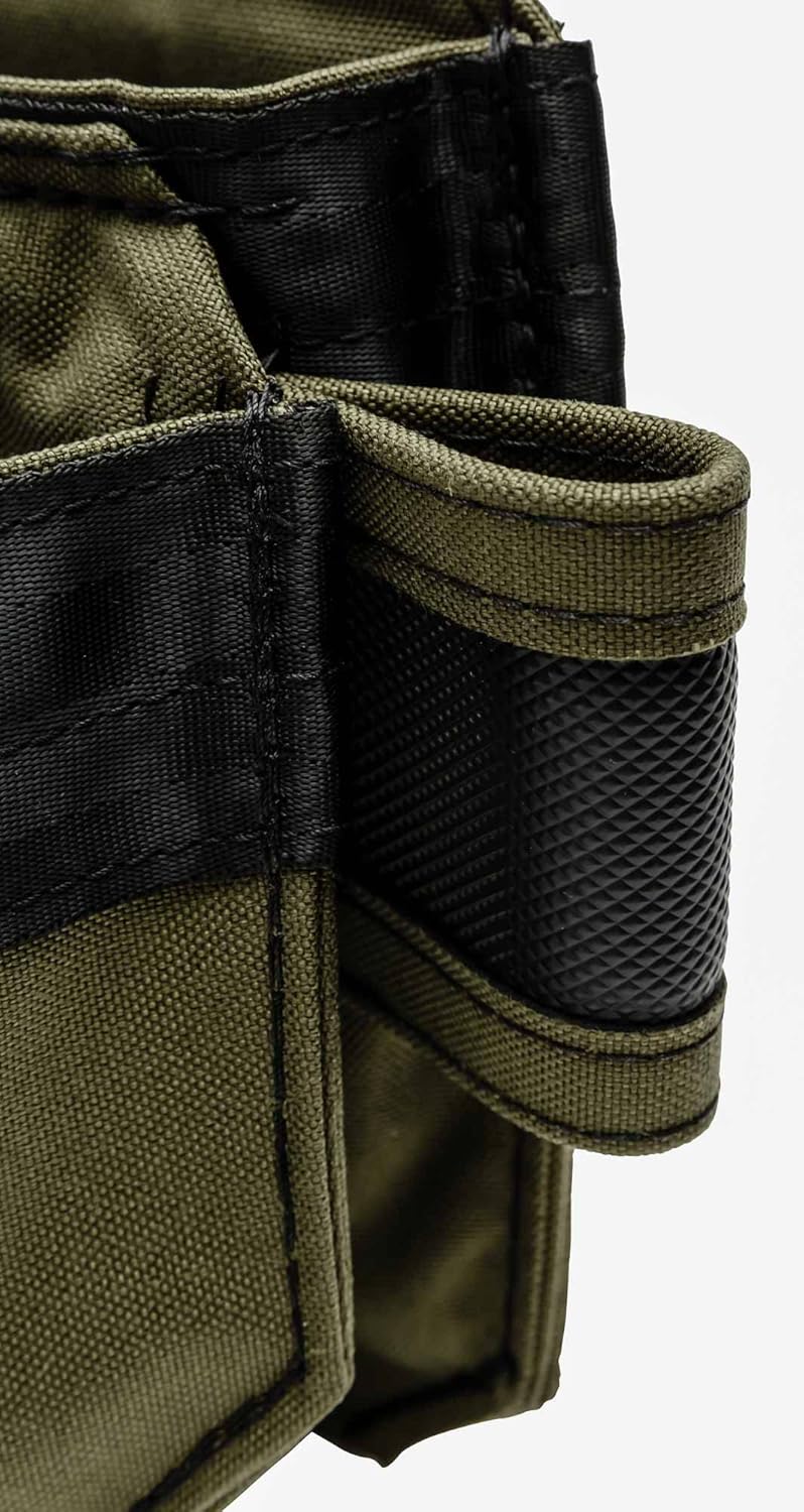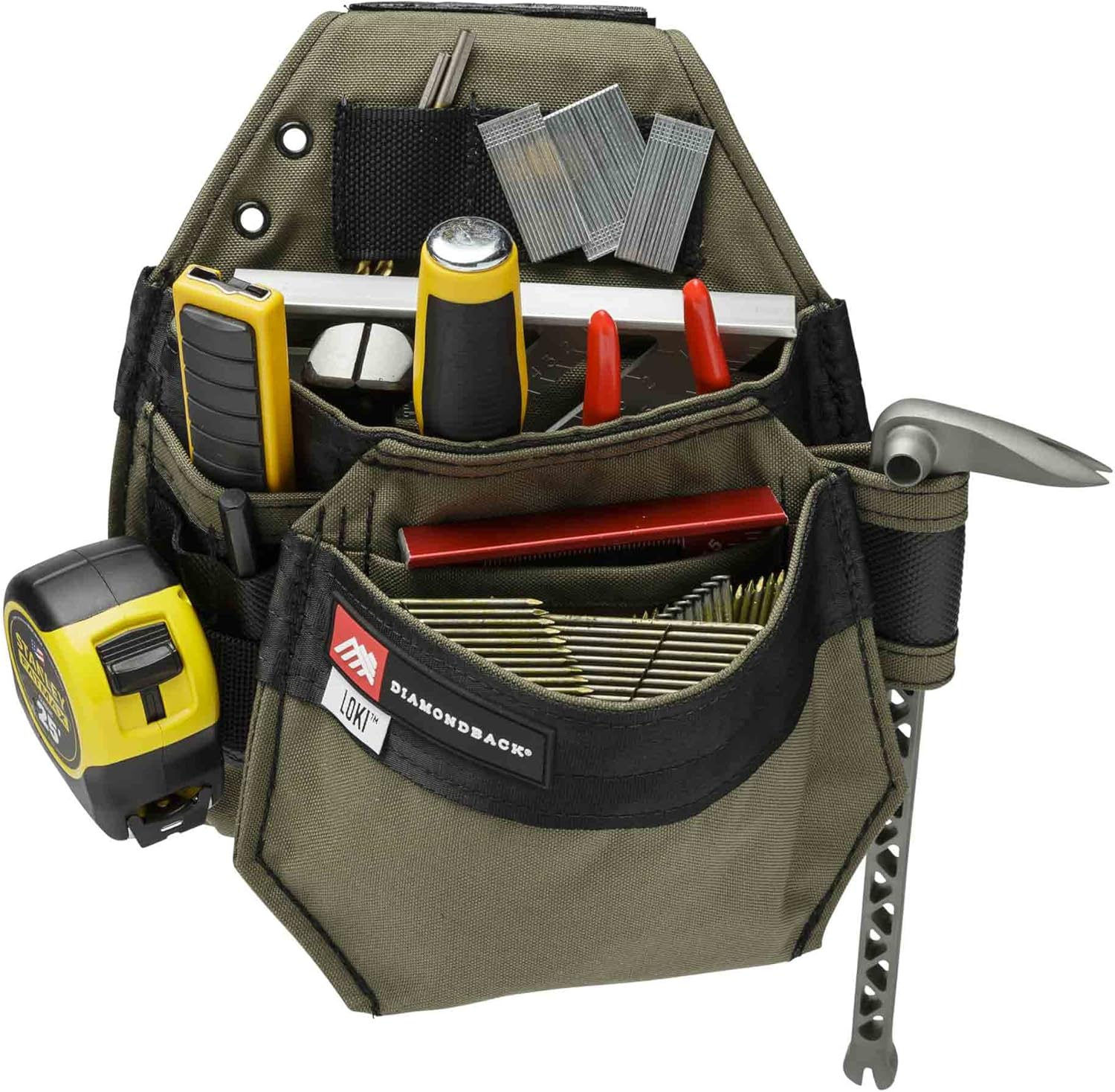 HIGHLY FUNCTIONAL The Loki is the smallest Diamondback pouch capable of holding a full size Speed Square and is designed for your dominant or non-dominant side. The angled corner design will keep items from getting stuck in the corners of the pockets. The tool slots are generously sized for irregularly shaped or large hand tools. 2 pockets, 7 tool slots, 1 external tool loop for attaching accessories, pocket divider, drill bit clip, stiff webbing strip for hanging tape measure. LIGHTWEIGHT construction and ergonomic design reduces back pain and promotes overall physical health while at work and on the job. This pouch is much lighter than leather and stands up to tough everyday use. Improve your efficiency by carrying more tools and accessories while making fewer trips back to the truck. PREMIUM MATERIALS Pouches and belts are made from military-grade 1000D Nylon, flame-resistant, quick-drying, patented SuperFabric. Professional grade, long-lasting and will stand up to regular use by tradespeople. Backed by a 5-year warranty. PERFECT FOR ALL TRADES: All of our pouches and bags are designed and created in conjunction with trade professionals for ultimate performance and comfort. We field-test all of our products to ensure maximum use and efficiency. Toolbelts for carpenters, roofers, drywall, trim carpenters, framers, and electrical. Our products help tradespeople do the job better and stay organized. Great for an electrician, contractor, plumber, HVAC, carpenter, maintenance tech, rigger, handyman, and DIY.