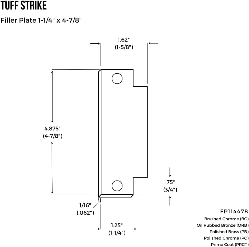 EASY TO INSTALL! Screws, filler plate and installation instructions are included. HEAVY DUTY! Maintain the security of the door while repairing removed strike plate. Our steel t strike plate ensureses that the door jamb is fully protected. EXACT FIT! Measures 1-1/4" x 4-7/8". This size fits most doors and provides a seamless and full coverage to repair removed hardware. MULTIPLE FINISHES! Available in multiple finishes to match the finish of existing door hardware.