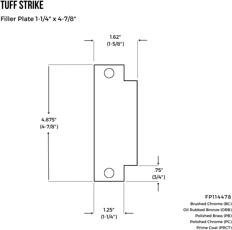 EXACT FIT! Measures 1-1/4" x 4-7/8". This size fits most doors and provides a seamless and full coverage to repair removed hardware. Easy to install ASA/ANSI dummy filler plate. Available in multiple finishes - Brushed Chrome, Oil Rubbed Bronze, Polished Brass, Polished Chrome and Prime Coat. BULK ORDERING! Contact seller to order in bulk quantities! HEAVY DUTY! Maintain the security of the door while repairing removed strike plate. Our steel t strike plate ensureses that the door jamb is fully protected.